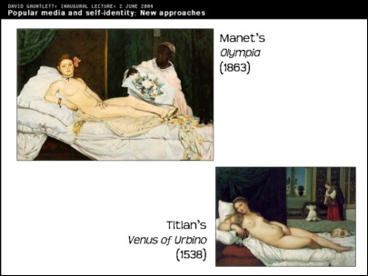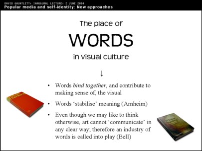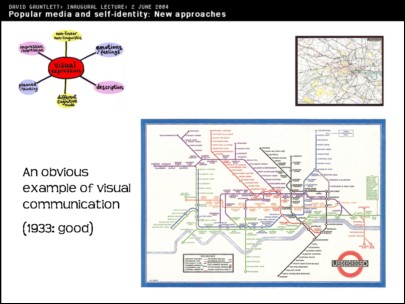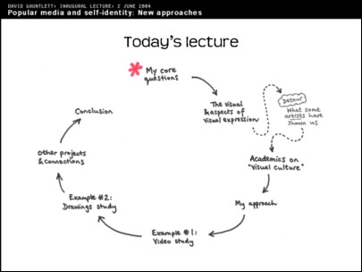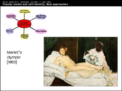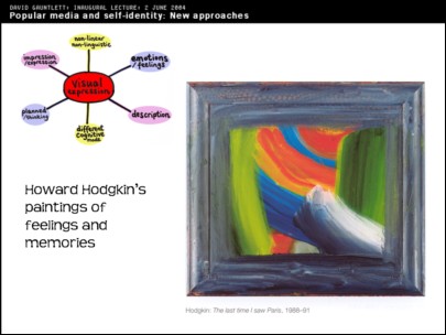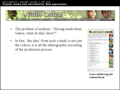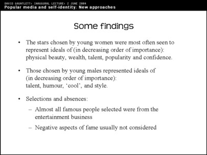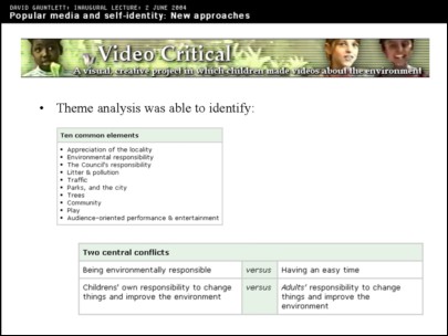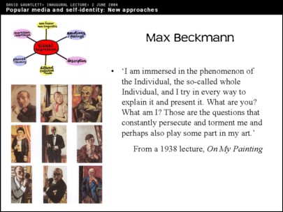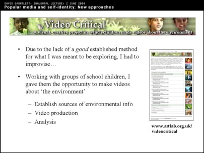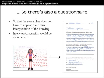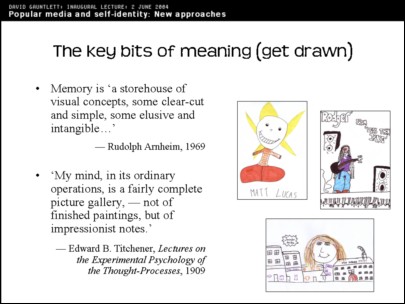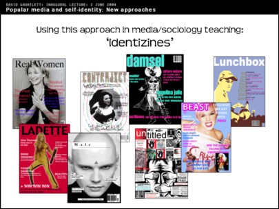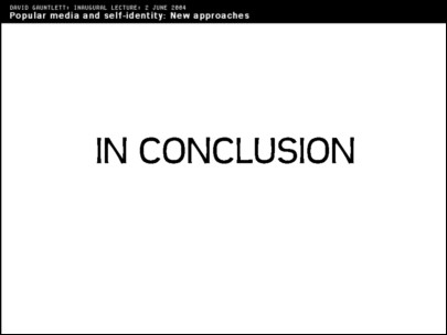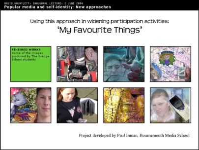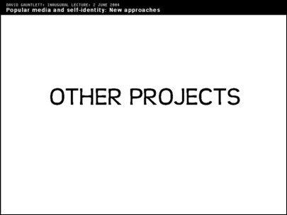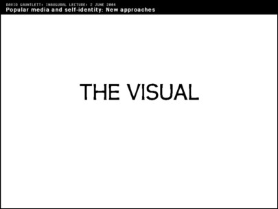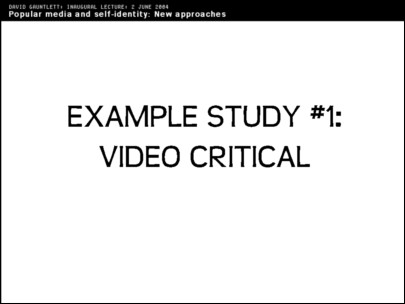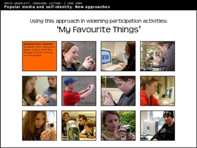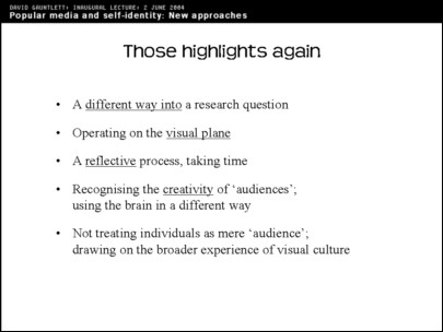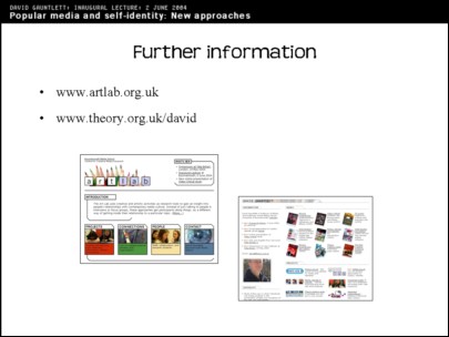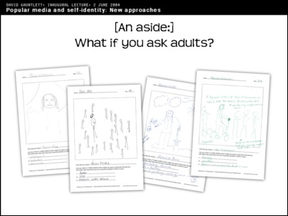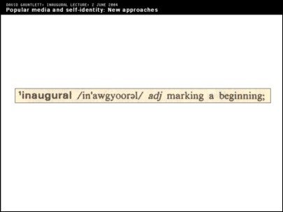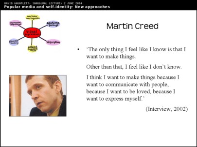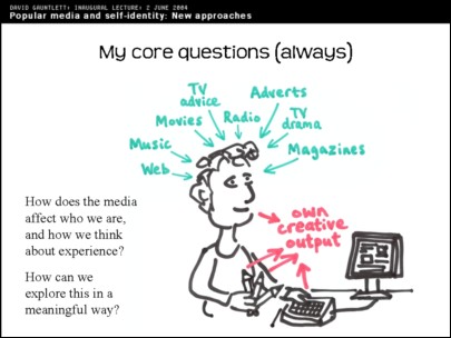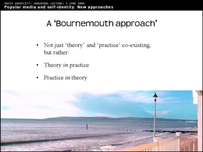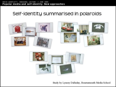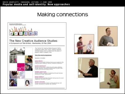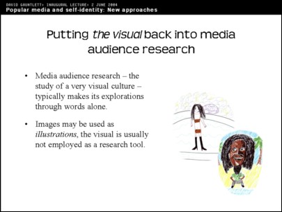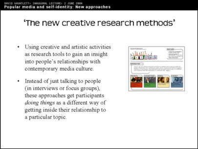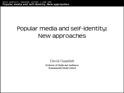 and Self-Identity: New approaches David Gauntlett, appointed as Professor of Media and Audiences at Bournemouth University in January 2003, delivered his Inaugural Lecture on 2 June 2004. The talk explains his work with 'new creative research methods' up to that date, outlining some of the philosophy behind it and discussing particular case studies. Note that as time goes by, this lecture becomes increasingly 'historical'; since June 2004 we have developed new projects which you can read about elsewhere on this site. The text below is a transcript, and therefore is in the style of a talk, rather than the style of an academic journal. To print it out, use the version for printing, which is optimised for printer output. You can also view a streamed video of the event. As always on the web, there is a compromise between file quality and download speed. The slides here are compressed so that all 62 of them add up to just 1.7 MB, which is quite slim. However, you may need to wait a minute for them all to load.