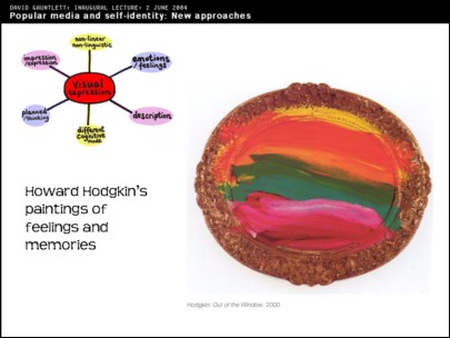 ... is my extension of the standard diagram, where we look at people's own creative expressions as well. That doesn't mean that people need to be painters, or people who spend each day doing a little drawing; people's creative self-expression can just be through their speech, through their clothing and through all of the different ways that we express ourselves. And, in the kind of research that I do, I actually get people making creative things in a way that's a bit unusual for them and pushing them a bit. But it's part of my standard view of the world that people are always being creative, are always creating expressions of themselves in different ways, putting stuff out into the world about who they are. And this is bound to be affected, in some way, by the media. The media, I always think, affects how we see relationships a lot because when you start out in life, you don't know what happens when you're in a personal relationship: you've only got your relationships with your friends and family to go on. But we see an awful lot of that in the media. When people have their first personal intimate relationship, the only experience they've really got to go on is stuff they've read in books and stuff they've seen on films or TV. So I think that's just one area, of the many, where the media is bound to influence what we expect and what we get out of those experiences. On the other hand, none of you think that the media makes us who we are. It's typical, in surveys, to find that people are worried about the power of the media or worried that the media is going to be affecting other people: the fear is that people will see things on particular TV shows or soaps or reality shows and this will affect them adversely. But if you ask anybody if they feel that they, themselves, have been directly affected by anything in the media, they'll say 'Of course not, that's just ridiculous.' So there's some distinction there between what people assume is happening to other people and what people assume is happening to themselves. This is an area that I think is worth exploring.