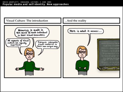 Media audience research typically this is the critical bit uses words to explore visual culture. Which I don't think entirely makes sense. Normally to explore people's relationship to the media which, as we know, is very visual, very much all around us, with lots of images researchers normally get people in a room, sit them down and ask them about their relationship to the characters on 'EastEnders' or whatever. They make it much more specific [to particular media forms]. They make it much more language based. People have to explain in words, instantly, how they relate to certain media things. And that's not easy. Images in media studies are quite often used as illustrations, or we might show video clips in lectures, but the actual making of images doesn't normally form any part of media studies.