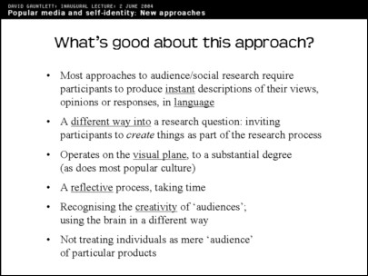 It's a different way into researching media audiences. Not necessarily better but it's a different way in. It operates on the visual plane, like the media does, so that's good. It's a reflective process, different to the instantanity of interviews or whatever. It recognizes people's creativity, uses the brain in a different way, and it's not treating people as mere 'audience' or mere research fodder, because it's hoping to engage with the audience and do something more interesting and creative with them.