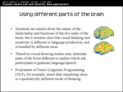 What we learn by looking at brain science is that it's very complicated. Scientists once thought that there might be a specific part of the brain for language, another part for visual perception, another perhaps for creativity. But now we know it's not that straightforward. However what I have been able to establish, I think, is that if you get people doing creative visual tasks, it does spark off different bits of the brain compared to if you give them a task which is producing language, i.e. if you interview them about their media use, you're setting them a language task. That's different to if you ask them to do drawings or collages or video making or other artistic things. Another point that's on [this slide] is that the proponents of Neuro-Linguistic Programming (NLP) that's another kind of self help discourse that I'm not an expert on but they're very keen on visualizing, and emphasise that visualising a problem is a qualitatively different way of thinking about it compared to other forms of thinking. Also there are accounts of how geniuses of the past have been visual thinkers in unusual ways. Einstein, and Disney, and Da Vinci, and Mozart, were all visual thinkers for whom mentally picturing their creative works whether inventions, or cartoon stories, or pieces of music was the most important starting point of their creative process.
