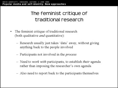 The feminist critique of traditional research also influenced me in my early days and, if you look at this, or as I explain it, you'll find that in fact it's not feminist in any gender sense. It's just about being nice basically, which feminists were keen on. No doubt still are. They had this critique of traditional research which was particularly striking in the early '90s (when I was looking at it). They made this point that research usually just takes data away. You've got researchers that go into a school, or they stop people in the street. They get data off people, information about how they feel about an issue, and then they say 'Thanks', and they leave, and that's it. So it's not a process between the explorers and the explored, as it were. It's not any real kind of interaction. It's not any real kind of dialogue. It's just that researchers come in, take something, and go away again. So the participants are not involved in the process. The feminists emphasised that you should work with your participants, to establish what their agenda is, rather than turning up with your own agenda and saying 'Hello, do you agree with this, this and this.' Instead you should meet with these people and find out what the key issues are as far as they are concerned.
