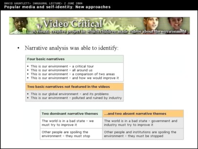 And if you analyse the narrative, you could find that four narratives typically showed up: it was normally one of those four. But you can look for what absences and silences there are in the videos, and find that two basic narratives not featured in the videos were 'This is our global environment and its problems,' and 'This is our environment polluted and ruined by industry'. They never blamed industry or the Government, primarily (I say) because TV and the media never blamed industry and the Government. Children's TV and the media always made it an issue about picking up litter and recycling and local stuff, and children followed that agenda. Not in a blind or stupid way, but just because nobody had told them any other agenda. Similarly you've got the two dominant narratives there: 'The world is in a bad state we must try to improve it,' and 'Other people are spoiling the environment they must stop'. And they didn't have narratives such as 'The world is in a bad state government and industry must try to improve it,' or 'Other people and institutions are spoiling the environment they must be stopped'. But really the study isn't just about stuff that can be summarized in tables so maybe I shouldn't even bother doing that at all. It's not just about the media messages received or not received. It's also about this whole thing of what they did with the messages, what they were able to do with the messages, what they were able to do with information which they got from different sources about the environment and how they felt and how they were able to express this in a creative way in the videos. They were clearly very media literate. Even the children as young as seven did quite satirical videos which spoofed the styles of TV shows that they'd seen. And you could see them really sort of working through the issues and being creative media producers themselves. Which is not something that people often get the opportunity to demonstrate in a media studies study. Normally people are positioned as audiences and they have to give their responses. Here they are able to be more creative and expressive. And when they had the opportunity to do that, they were able to do something interesting. The kind of studies that I like least, I suppose, are those that just position people as victims of the media, or people who can only respond in a particular way to what they've seen. So when American 'scientists' are setting people up in a particular way so that they can measure one particular response, it seems to not give the participants any opportunity to express themselves in a different way or to say that they don't think 'this', in fact, they think 'that', and to step outside the box. So I like approaches that allow people to step outside the box.