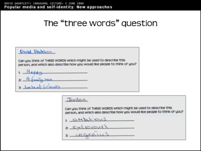 ... which is the 'three words' question, which says: 'Can you think of three words which might be used to describe this person and which would also describe how you would like people to think of you?'. I tried to put it into simpler words but I couldn't. David Beckham, for example, was described as 'happy', 'a family man' and having 'lots of friends'. I think that's quite nice. (This was before the Beckham affair allegations earlier this year). It doesn't contain anything about soccer skills you will notice, and it's got him in his family/father role, which is quite interesting for a 14/15 year old boy I think. It shows that they're thinking about stars in slightly different ways to the kind of stereotypical way that you might think people were thinking about stars. These are just typical examples. Jordan, the glamour model, is described as 'ambitious', 'extrovert' and 'ingenious', and I think adjectives like that are quite interesting. People don't typically think of Jordan as being ingenious in particular, it's probably fair to say. But I talked to the girl who had done it and she did think Jordan was ingenious, because she'd used her skills which this girl, herself, did seem to think were quite limited skills but she'd used her skills in a way to make lots of money and to be successful and to be in the public eye but in particular to make lots of money and this was seen as ingenious. Which is fair enough.