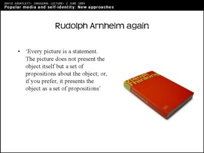 So, then we've got the question of the place of words in visual culture. I may get very enthusiastic about the visual world, I still work as an academic, I give lectures, I write articles; words are clearly important to me. And words are clearly important everywhere else. I considered illustrating this by bringing in a copy of Hello magazine and taking the staples out. The staples being pretty much like the words: they're the thing that bind it together. If you've got a copy of Hello magazine with the staples taken out, well then, it's not bad, you can look at it. It's fine, but a bit unsatisfactory. If you got it from the shop like that, you wouldn't really want it, you'd prefer one with the staples in. And the words perform the same role in Hello magazine, I would say. If I give you a copy of Hello magazine without the words in, it would be alright. It wouldn't be as good as one that had the words in, but it wouldn't make that much difference. Same with the staples, the words help to bind it together, but they're not the most important thing. Hello magazine without the pictures, though,wouldn't be worth it. You'd be storming straight back to WHSmiths [newsagents], whereas without the words or the staples, you wouldn't maybe mind so much. So words bind together the way we think about the visual world, and we use words to think and to communicate. Words are clearly important, and I don't want to do down words or language. But I want to bring the visual into what we do in media studies more I suppose. Rudolph Arnheim I like him in that book called 'Visual Thinking' that we see here, says that words 'stabilize' meaning, which I think is quite good. In other words, in the interpretation of any particular visual or artistic thing, then, once people have managed to explain it or set it down in words, then it brings stability and consensus. Julian Bell in another very good book called 'What is Painting?', talks about how art can't communicate in any straightforward way. People talk a lot about how artists express themselves and how they communicate. But it's not in any way that can be pinned down and when painting was first seen as being a medium of self expression, about 200 years ago, and ever since then, parallel to that has sprung up an industry of people trying to pin that down in words and to clarify and explain by putting things into words. To stabilize the market, he says, as much as anything else. If you didn't have experts using words to explain the art works, well then you'd be all at sea. Maybe in a nice way. But it makes us feel uncomfortable, so we pin it all down using words.