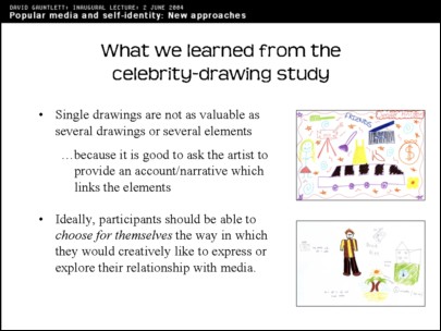 This is a particular wordy slide, I'm sorry, but it tells me all my key points. The good thing about this approach is, as I've already said, most approaches normally ask people to provide instant descriptions of their responses to particular kinds of media, using language. That's not easy. It can't always be assumed to work. My approach is a different way into it. It's not necessarily better. Asking people to explain their feelings about things in language is often good and you get their gut reactions, or what they say when you ask them a question you get their response. That's often useful. But it's not the only way to explore these things. Instead the kind of work I do operates on the visual plane which, as I've said, is the same plane that much of the media is operating in. So that's good: you've got a match. Often it's a reflective process, taking time; because if you ask people to make a creative work they have to think about what they're going to do, then they do it. Then you ask them to reflect on it (so ultimately it does come back to language again); you can explore what they've done with them. But they've had that creative process first. So that's something which takes time. It's different to when I ask you a standard interview question, like 'What do you think about such-and-such a celebrity?', people have to tell me using words. This is different. It's a more thoughtful, reflective process and even the act of creation, I think, makes a difference: if you are asked to do a drawing as part of a research process, then you kind of have to make particular shapes and movements with your arms, and your body, to make a drawing. It kind of comes through your body, in a different way to if you're just speaking using your brain and your standard linguistic functions, I think. It doesn't necessarily reveal more, but maybe it can do. This approach recognizes the creativity of audiences, and you're using your brain in a different way as well. If you're asked to do a creative visual task then it uses different parts of the brain. I'm going to say a bit more that later. Also this kind of approach tends not it can do but it tends not to treat people as 'audience' of particular things. A standard approach in media studies is to see people as the audience of a particular thing. Women are the audience of women's magazines, certain people are the audience of 'Big Brother', or whatever. Whereas my kind of approach tends to see people as being individuals who are influenced by lots of different bits of the media which come at them at all times and which then have to be assimilated by their brains into different kinds of response. So it's not seeing people as a specific, particular audience of a specific, particular bit of media. It's seeing them more as people who exist in a media filled society.