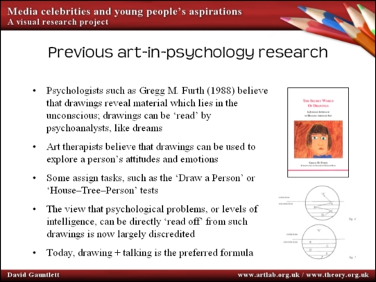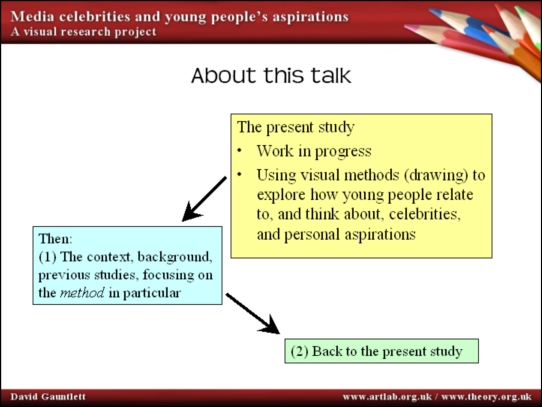 MEDIA CELEBRITIES AND YOUNG PEOPLE'S ASPIRATIONS - A visual research project This project is under way at the moment, with fieldwork being conducted November 2003 - March 2004. I gave a talk about the 'work in progress' at the UK's Media, Communication and Cultural Studies Association conference (19–21 December 2003). The Powerpoint slides appear below. Of course, viewing the slides without the explanations doesn't give you much depth or detail, but hopefully the slides are reasonably self-explanatory.