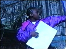 in the playground: 'This is our school!'. Then to Charlotte, in the school grounds,